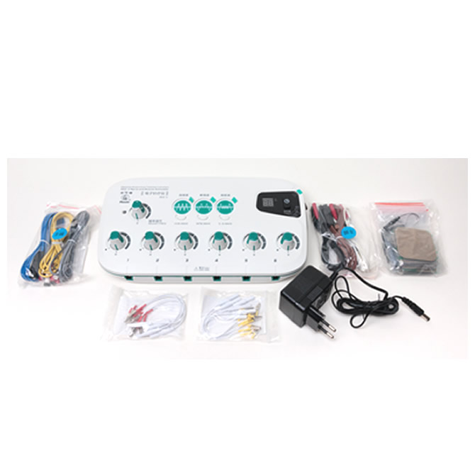 electroterapia con 6 canales de salida, así como un temporizador y niveles de frecuencia ajustables. Basado en los instrumentos electrónicos de tratamiento para acupunturas tradicionales, el Estimulador Nervioso y Muscular combina la tecnología moderna de un